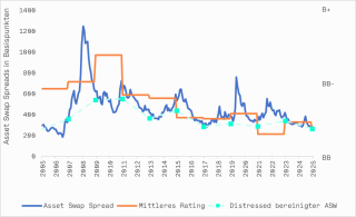 Die folgende Abbildung zeigt die Entwicklung des Asset Swap Spreads in Basispunkten (Primärachse, links) im Zeitraum von 2005 bis 2025. Zusätzlich wird das durchschnittliche Rating (Sekundärachse, rechts) dargestellt, was die durchschnittliche Bonität der zugrunde liegenden Emittenten widerspiegelt. Neben dem klassischen, gewichteten durchschnittlichen Spread-Level wurde auch noch zusätzlich die um Distressed Bonds bereinigte Risikoprämien angeführt.