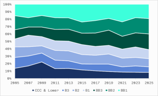 Ein Trend, der in diesem Zusammenhang nicht unterschätzt werden sollte, ist die zunehmende Bedeutung von Privat Debt. Unternehmen mit schwächerer Bonität nutzen gezielt diese alternative Finanzierungsform, da sie dort flexiblere Konditionen als auf dem traditionellen Anleihemarkt erhalten. Die Folge: Im öffentlichen High Yield Markt sind zunehmend die besseren Schuldner vertreten, während besonders risikoreiche Emittenten den klassischen Kapitalmarkt fernbleiben. Dadurch sinkt das durchschnittliche Spread-Niveau im Index, ohne dass dies zwangsläufig auf eine geringere Attraktivität im High Yield Markt hinweisen muss, da in weiterer Folge auch die Ausfallswahrscheinlichkeit zurückgegangen ist. Diese Entwicklung steht in engem Zusammenhang mit den strukturellen Veränderungen am High Yield Markt.