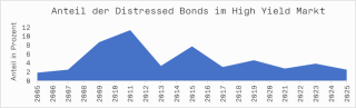 Distressed Bonds – also Anleihen mit besonders hoher Ausfallwahrscheinlichkeit und entsprechend hohen Spreads – üben einen erheblichen Einfluss auf den durchschnittlichen Spread eines Index aus. In Stressphasen steigt der Anteil dieser Wertpapiere deutlich an und trägt spürbar zu außergewöhnlich hohen Durchschnittswerten bei. Gegenwärtig liegt der Anteil von Distressed Bonds, gemessen beispielsweise an Anleihen mit Spreads von über 1000 Basispunkten, erstmals wieder bei lediglich rund 2,5 %. Ein ähnlich niedriges Niveau wurde zuletzt in den Jahren 2005 bis 2007 beobachtet. Allerdings hat sich die Bonität im High Yield Markt im Vergleich zu damals deutlich verbessert. Die nachfolgende Grafik zeigt den Anteil der Distressed Bonds im globalen High Yield Markt.